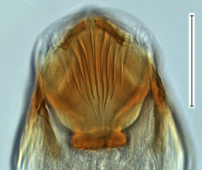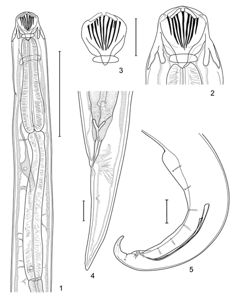 Hosts and localities:Type host: Northwestern red-faced turtle Emydura australis Gray, 1841. Prevalence 7/22 (31.8%), intensity 1-18 specimens. Other hosts: Sandstone Snake-Necked Turtle Chelodina burrungandjii Thomson, Kennett et Georges, 2000. Prevalence 3/16, intensity 2-7 specimens. Type locality: Ord River, Kununurra, Western Australia (15o47.533' S; 128 o42.310' E). Other localities: Lake Argyle Spillway (16o 07.371'S, 128o 44.271'E), Donkey Hole (16o 39.275' S, 125o 29.338' E), Minah Creek (17o 06.627' S, 125o 21.012' E), Bell Creek (17o 10.159' S, 125o 21.521' E), Geike Gorge (18o 06.259' S; 125o 42.056' E) all in Western Australia. Site of infection: intestine. Description (after Kuzmin et al, 2009)General. Slender worms. Body cuticle finely striated transversely, striation visible from posterior ends of tridents to tail end. Head end rounded, tail end tapering. Oral opening narrow, slit-like, with rounded corners. Eight cephalic papillae present in two circles: four minute flattened papillae closer to oral opening, and four large rounded papillae of outer circle. Buccal capsule typical for the genus. Each valve of buccal capsule usually with nine internal ridges: one median ridge, four ventral and four dorsal ridges. Ridges are angled medially from anterior to posterior. Anteriorly, distance between median ridge and nearest dorsal and ventral ridges somewhat larger than between other ridges. No incomplete or interrupted ridges were observed, however, two additional short ridges were present in one specimen. Median ridge may be shorter than two proximate ridges. Thick, sclerotized ring present at base of buccal capsule. Buccal capsule valves supported by two prominent dorso-ventral tridents having three posteriorly directed prongs. Central prongs of tridents somewhat longer than sublateral ones. Tridents' posterior ends reach beyond level of basal ring. Deirids minute, papilla-shaped, situated somewhat anterior to border between muscular and glandular esophagus. Muscular esophagus with elongated posterior bulb. Glandular esophagus about 1.6 times longer than muscular esophagus. Three prominent large nuclei at posterior end of glandular esophagus. Intestine straight, narrow. Rectum straight, thin-walled. Males (measurements for holotype and two paratypes). Body 11.891 (10.205, 11.642) mm long, 195 (164, 189) wide. Posterior part of body coiled ventrally. Buccal capsule 152 (135, 146) long, valves 129 (113, 123) long and 125 (115, 117) wide in lateral view. Sclerotized ring 23 (22, 23) long and 76 (67, 78) wide. Muscular esophagus 560 (520, 547) long, glandular esophagus 873 (870, 939) long. Distance from anterior end of body to posterior end of esophagus 13.8 (14.2, 15.8) % of body length. Nerve ring at 281 (248, 269) from anterior end. Deirids at 104 from border between muscular and glandular esophagus (measured in 1 male). Anterior part of testis is slightly twisted. Caudal alae low, ventro-lateral. Anterior part of alae somewhat elevated and joined on ventral surface forming pseudosucker. Posterior ends of alae behind level of tail midlength. In precloacal portion, alae supported by 7 pairs of pedunculate papilla. Anterior pair of papillae supporting posterior part of pseudosucker. Five pairs of postcloacal papillae present. Posterior to cloacal opening, caudal alae supported by two pairs of ventrolateral papillae. Two pairs of subventral papillae situated closely to each of first ventrolateral papilla, thus forming a group of three papillae on each side. A pair of minute lateral papillae situated closer to tail tip. A pair of papilla-shaped phasmids present at level of second pair of postcloacal ventrolateral papillae. Additionally, 2 pairs of sessile papilla, surrounding cloacal opening. Spicules unequal. Right spicule 394 (381, 390) long, more sclerotized, with elongated funnel-shaped anterior part and pointed end. Its distal part needle shaped, slightly curved ventrally. Left spicule 339 (312, 326), less visible, with sharply pointed end. Anterior ends of spicules posterior to level of pseudosucker. Tail conical, with rounded end, 186 (177, 194) long (1.6 [1.5, 1.9] % of body length). Females (measurements for 11 paratypes, mean value and limits). Body 16.368 (12.922 – 19.034) mm long, 232 (159 - 275) wide. Buccal capsule valves 143 (135 - 153) long and 149 (137 - 179) wide. Sclerotized ring at base of buccal capsule 88 (75 - 94) wide, 23 (22 – 24) wide. Total length of buccal capsule 166 (157 – 176). Muscular esophagus 621 (555 - 658), glandular 991 (712 - 1062) long. Distance from anterior end of body to posterior end of esophagus 10.8 (9.8 – 11.9) % of body length. Nerve ring at 310 (292 - 329) from anterior end. Vulva pre-equatorial, 7.625 (6.076 – 9.273) from anterior end. In gravid females, both lips of vulva prominently elevated (Fig. 11). Tail conical, elongated, 232 (201 - 249) long (1.6 [1.4 – 1.8] % of body length), with rounded tip. Phasmids situated at about midlength of tail (Fig. 7). Illustrations