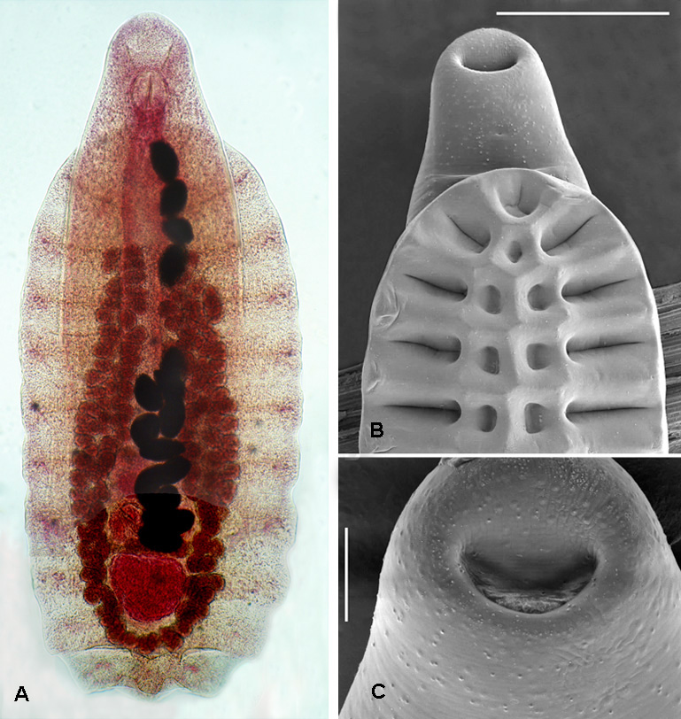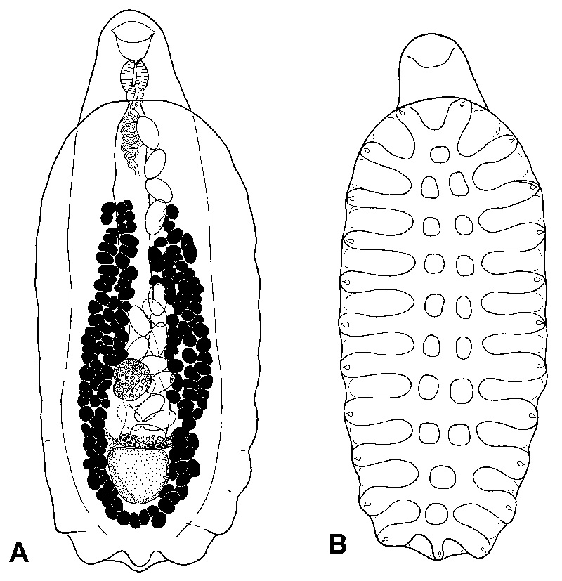 Neosychnocotyle maggiae. A - Ventral view of holotype, B - Arrangement of loculi on ventral disc. Scale-bar: 1 mm. |