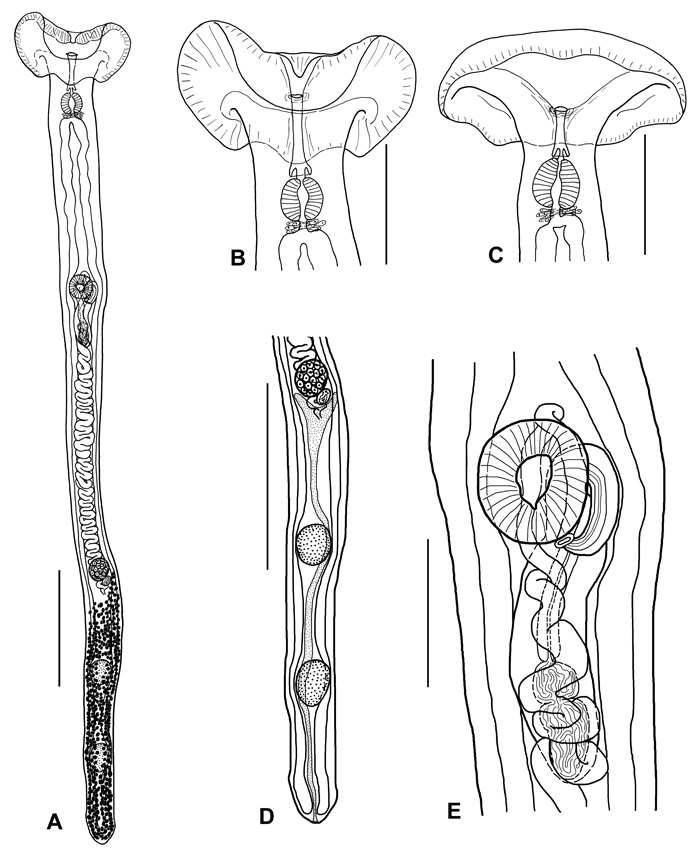 Choanocotyle platti Tkach et Snyder, 2007Type host:Chelodina rugosa Ogilby, 1890 LocalitiesType locality:Small billabong at Daly River Mango Farm, near Nauiyu Community, Northern Territory, Australia, 13° 44.302’S, 130° 40.838’E. Other localities:Daly River, near Oolloo Crossing, Northern Territory, Australia, 14° 00.31’S, 131° 14.46’E; Mary River, Opium Creek Station, Northern Territory, Australia, 12° 34.62’S, 131°43.48’E. Type specimens:Holotype: Queensland Museum (QM) no. G228974 (labeled: ex. Chelodina rugosa, Daly River, Northern Territory, Australia, June 2005, SDS-05-53A). Paratypes: QM nos. G228975, G228976 (labeled: ex. Chelodina rugosa, Daly River, Northern Territory, Australia, June 2005, SDS-05-53A), and nos. G228977, G228978 (labeled: ex. Chelodina rugosa, Mary River, Opium Creek Station, Northern Territory, Australia, June 2005, SDS-04-59A). Paratypes: Harold W. Manter Laboratory (HWML) no. HWML48612 (6 slides labeled: ex. Chelodina rugosa, Daly River, Northern Territory, Australia, June 2005, SDS-05-32A). GenBank number: EU196355.Description (after Tkach and Snyder, 2007)Body elongate, 6510; body width at level of ventral sucker
