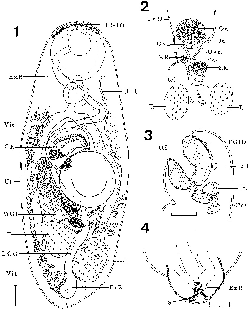 Thrinascotrema brisbanica Jue Sue et Platt, 1999Type host:Saw-Shelled Turtle, Myuchelys latisternum (Gray 1867) LocalitiesType locality: Lake Manchester, 30 km west of Brisbane, Australia (27°29’S, 152°46’ E). Other localities: Bell Creek, King Leopold Ranges Conservation Reserve, Kimberley Region, Western Australia, 17° 10.159’S, 125° 21.521’E; King River Pool, King River, Kimberley Region, Western Australia 15° 39.770’S, 128° 05.237’E; Miner’s Pool, Drysdale Station, Drysdale River, Kimberley Region, Western Australia, 15° 40.810’S, 126° 24.270’E. Type specimens:Holotype: Queensland Museum (QM) no. QM G215041. Paratypes: QM no. QM G215042-G215044 (3 paratypes, whole mounts); QM G215045. Description (from Jue Sue and Platt, 1999)To be addedIllustrations